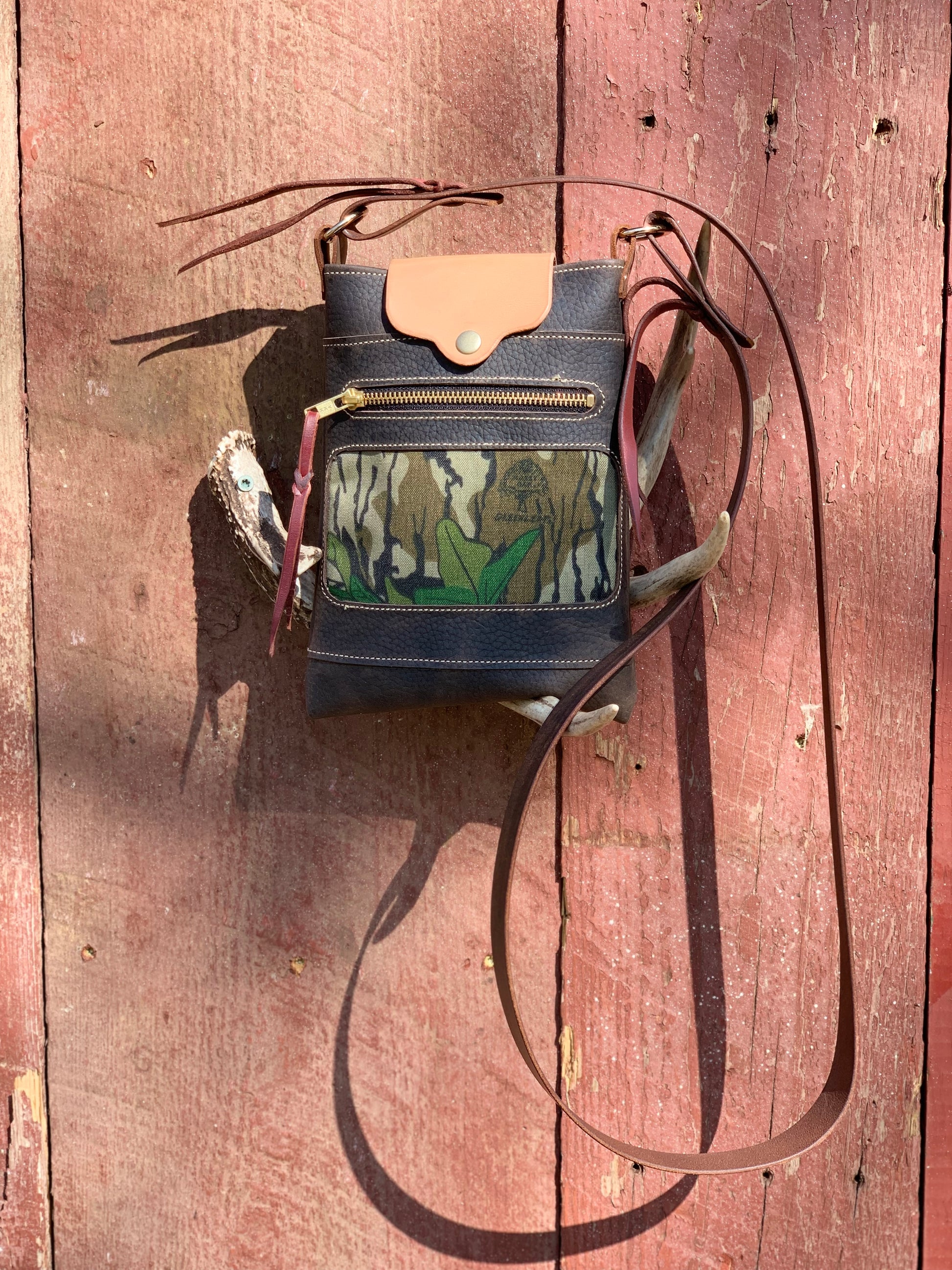 Our No. 2 Crossbody Purse is made from brown oil tanned leather with vegan tan leather snap fold over closure and mossy oak green leaf camo. Our No. 2 is roomy enough for all your essentials while the long strap allows for crossbody wear, freeing your hands for other things...like life!
